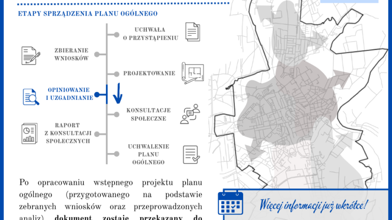 Po zakończeniu etapu opiniowania i uzgodniania planu przewidziano konsultacje społeczne, podczas których mieszkańcy będą mogli złożyć uwagi do projektu planu ogólnego.