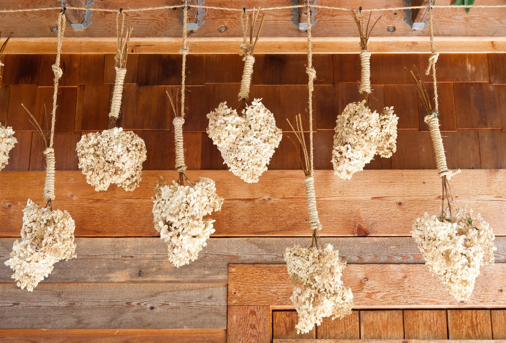 Tradycyjne suszenie wciąż jest niezawodne, zwłaszcza jeśli chcesz przygotować większą ilość kwiatów naraz. Hortensje należy związać w niewielkie pęczki i powiesić główkami w dół w suchym, przewiewnym i zacienionym miejscu. Po około dwóch, trzech tygodniach łodygi i kwiaty stają się suche, sztywne i gotowe do dekoracji.